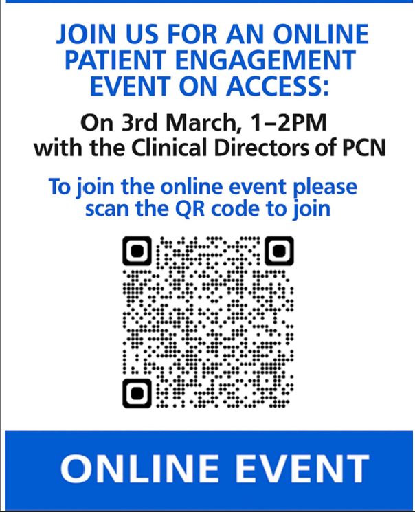 Dear Patients, This is an opportunity to join us and the PCN to discuss Access at the GP practices and discuss the results of the surveys that were completed by you in the last year. Please see below on how to join
